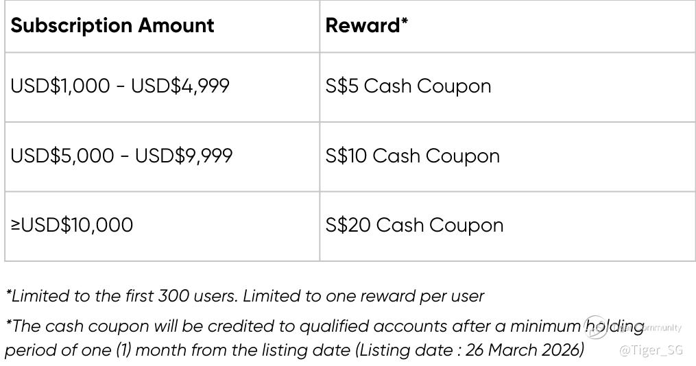 ^The cash coupon will be credited to qualified accounts after a minimum holding period of one (1) month from the listing date (Listing date : 26 March 2026)