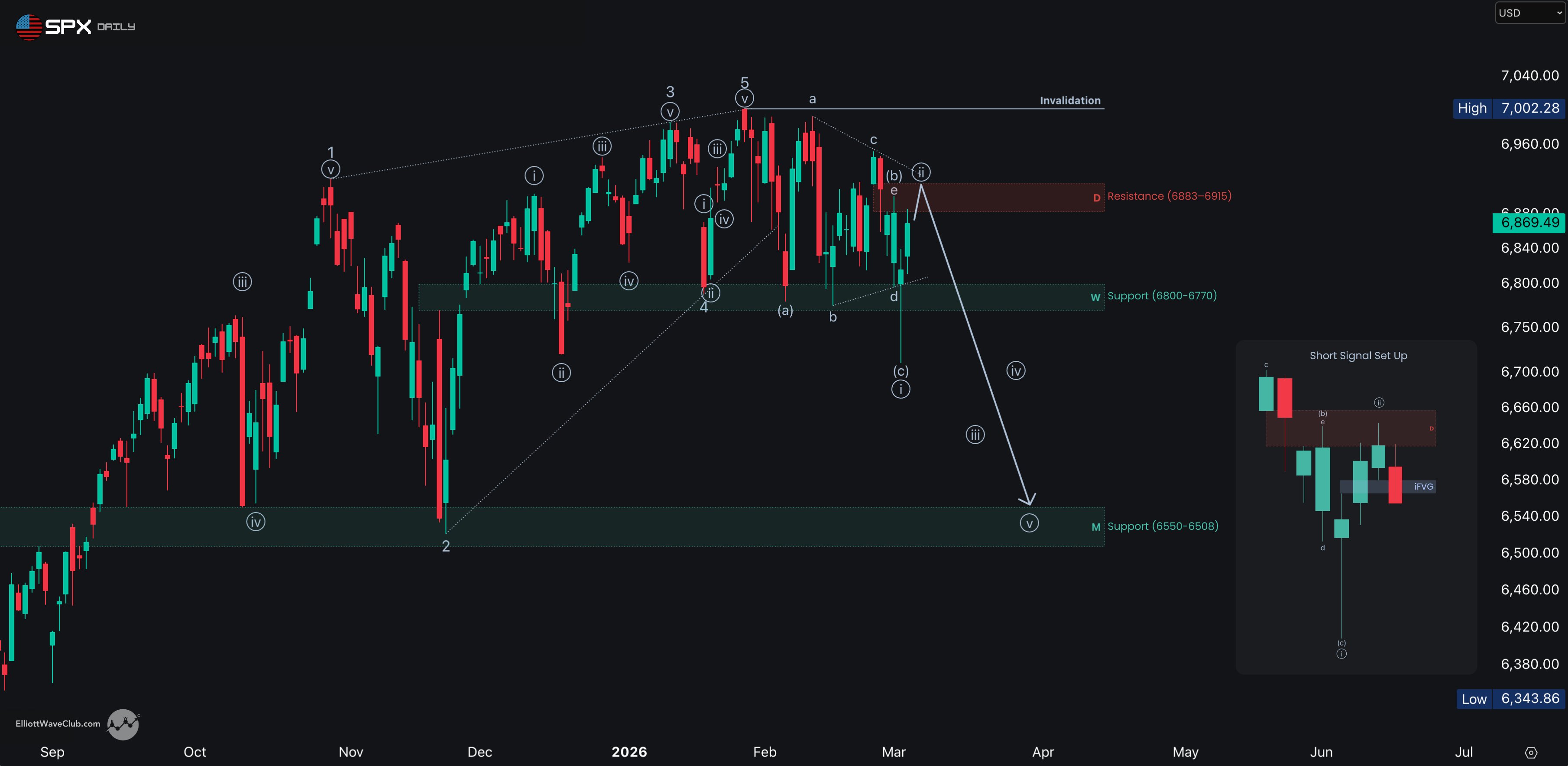 The ideal setup: price pushes deeper into this zone tomorrow, forms a bullish Daily FVG, then inverts it for the sell signal to trigger the 3rd wave decline to 6,550.
