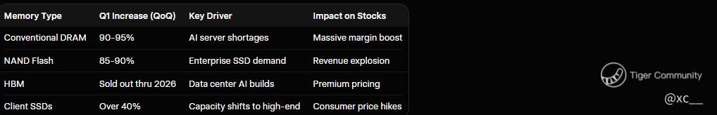 $NVIDIA(NVDA)$ $Micron Technology(MU)$ Buckle up, folks—the memory chip world is on fire! 🔥 With AI gobbling up storage like never before, prices are skyrocketing, and companies like Micron are poised to rake in massive gains. Imagine NAND Flash costs jumping a whopping 85-90% quarter-over-quarter in the first quarter alone—that's the fresh scoop from industry watchers, signaling a wild ride for storage stocks. 😲 But can Micron's upcoming report push things even higher? And will this "supercycle" stretch all the way to 2027, supercharged by smarter phones and computers? Let's dive deep into the chaos and opportunity. 📈