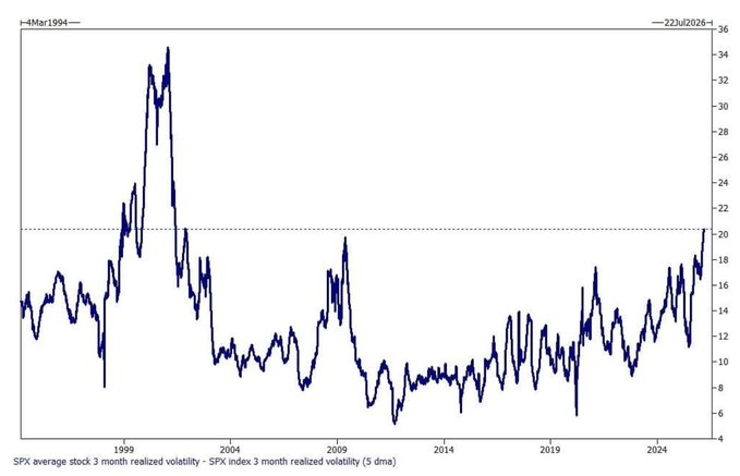 The average S&P 500 stock is now more volatile than the $SPX by the largest margin in roughly 25 years 🚨🚨🚨