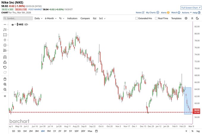 Nike $NKE not doing it 🚨 On the brink of hitting its lowest price since May 📉📉