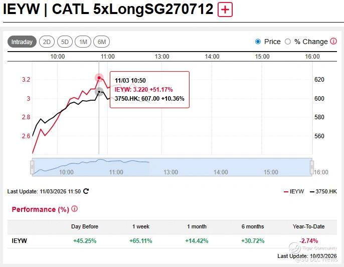 $NIO-SW(09866)$ jumped sharply at the open on Wednesday (11 March) after releasing its earnings results post‑market the previous day. Nio's share price surged 19.7% as the company reported its first profitable quarter in history. Amplifying the return, the Nio 5x Long DLC climbed as much as 100% shortly after the market opened.