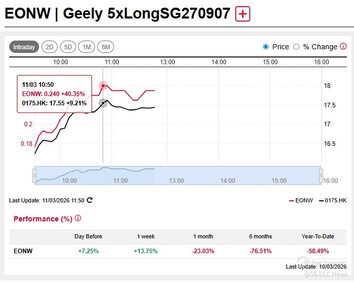 Other EV-related plays such as $CATL(03750)$ , $GEELY AUTO(00175)$ , $XPENG-W(09868)$ are also on the move, posting gains of 5-10%. With the respective 5x Long DLCs gaining 25-50% while the 5x Short DLCs are down by a similar magnitude.