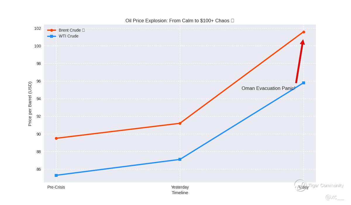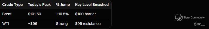 Energy traders are losing their minds right now as Brent crude just exploded 10.5% higher, blasting past the psychological $100 level and peaking at a jaw-dropping $101.59! 😱 WTI crude is right behind it, charging toward $96 and sending shockwaves through every corner of the market.
