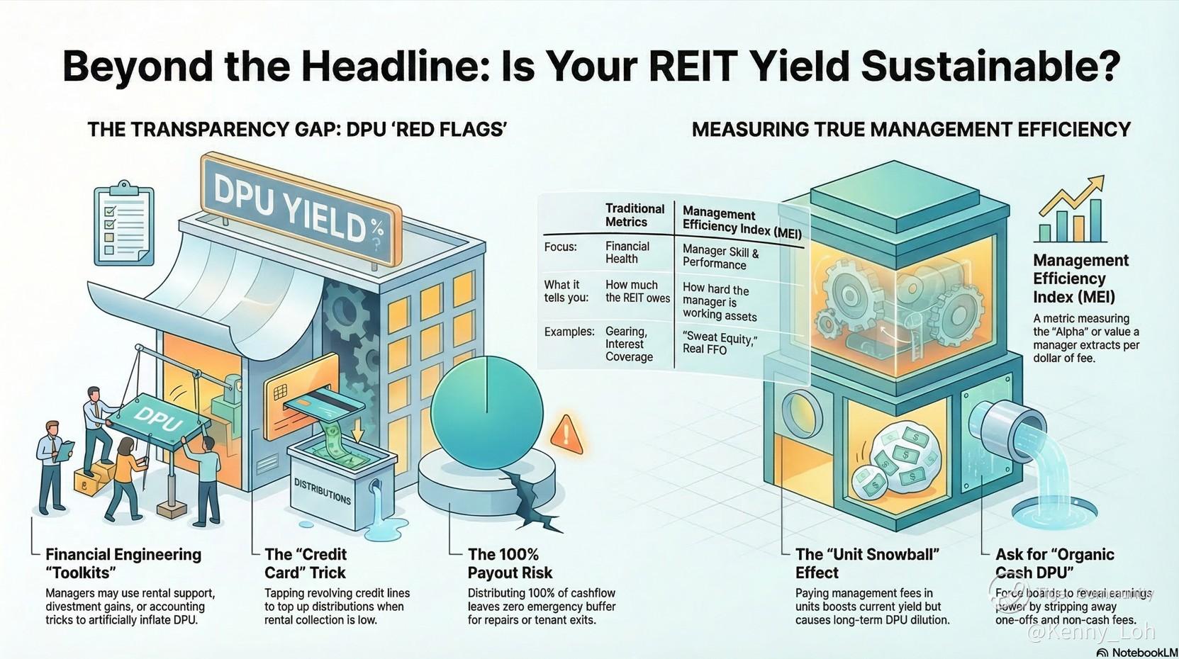 For many retail investors, the headline Distribution Per Unit (DPU) is the ultimate scorecard. It is the number that flashes on the screen, dictates the yield, and often determines whether a REIT earns a place in a retirement portfolio. However, as REIT specialist Kenny Loh warns, focusing exclusively on this headline figure can lead to a dangerous "Transparency Gap."
