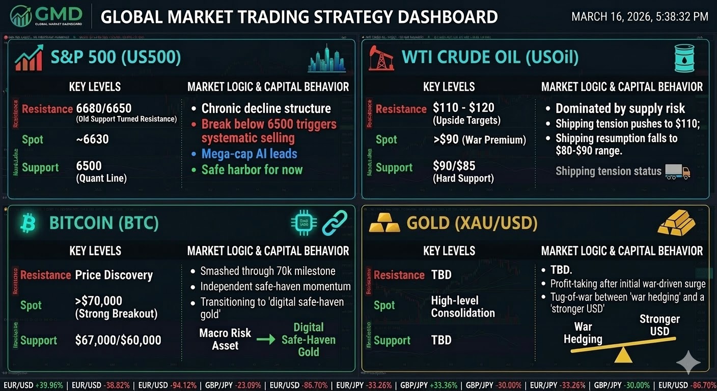 Liquidity Vacuum Alerts: Intraday liquidity can vanish instantly during war cycles. Blindly chasing prices near key resistance/support zones (e.g., S&P 6650) is strictly prohibited. Prioritize Limit Orders.
