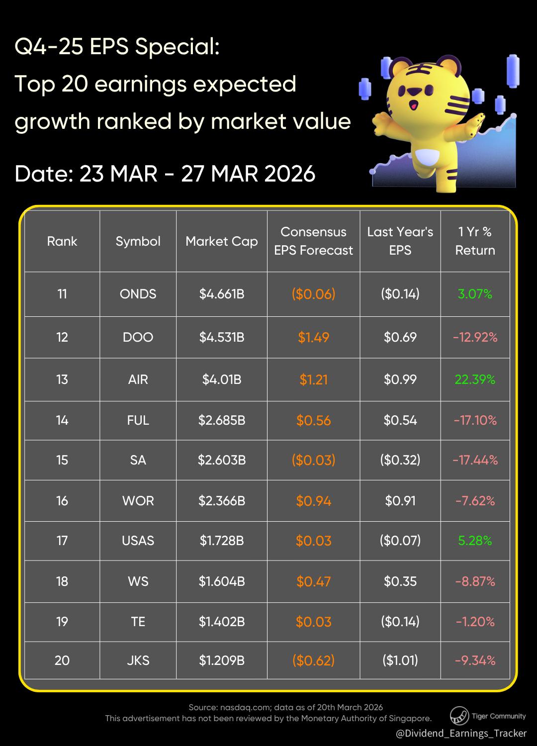 In the first part, we highlight the top 20 stocks by market capitalization with stronger EPS estimates ahead of their earnings, scheduled between March 23 and March 27.
