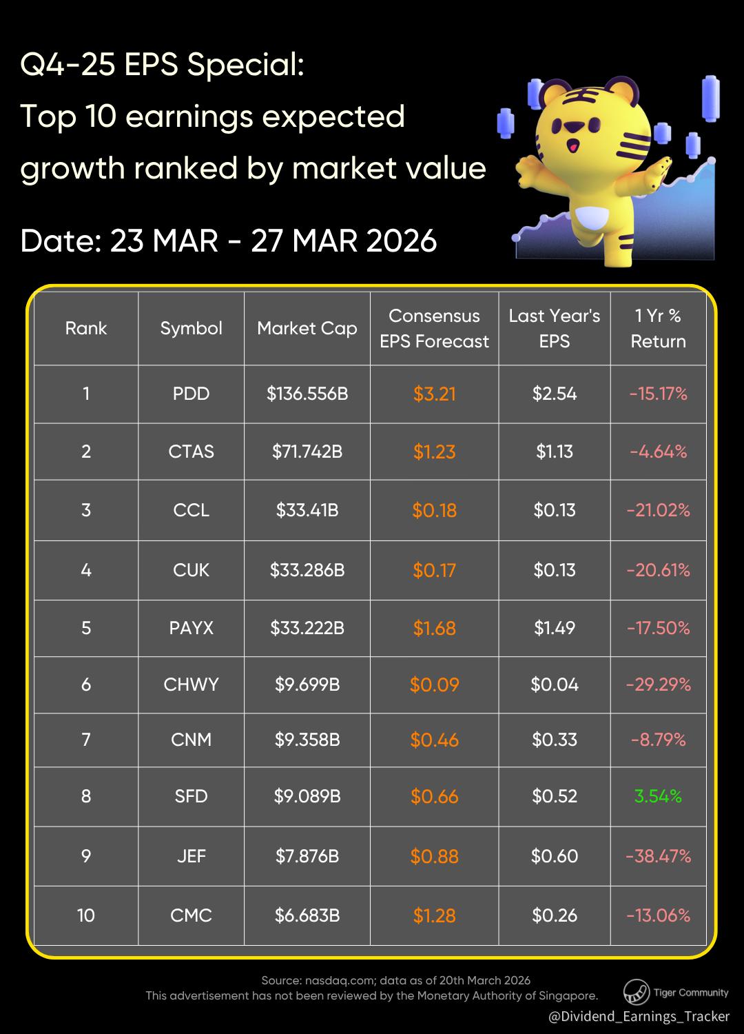 As we approach the earnings season from March 23 to March 27, 2026, several companies are poised to deliver strong earnings per share (EPS) results and have notable dividend performance. Below are insights on five companies: PDD Holdings Inc. (PDD), Cintas Corporation (CTAS), Carnival Corporation (CCL), Carnival plc (CUK), and Paychex, Inc. (PAYX).