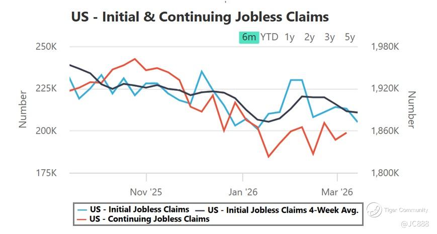 For the week ending 14 Mar 2026, US weekly jobless claims fell by -8,000 to a seasonally adjusted 205,000 from last week’s 213,000. (see below)