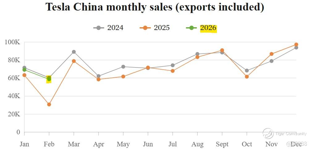In China, TSLA managed to hold its court with February 2026 domestic sales & exports coming in at 58,599 EVs, representing a +90.95% YoY increase and -15.23% lower than January 2026 sales. (see below)