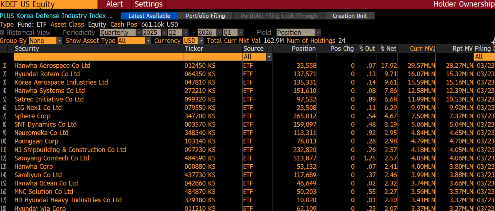 According to Bloomberg, Middle Eastern countries are lining up to buy South Korean air defense missiles because the US Patriot missile is too expensive, costing as much as $4 million. South Korea's Cheongung missile boasts accuracy comparable to the Patriot, but costs only a quarter of the price! The Cheongung missile is manufactured by the South Korean company LIG Nex1, with Hanwha Airlines providing the radar system and launch equipment. Both companies are publicly listed. In the ETF market, the $PLUS Korea Defense Industry Index ETF(KDEF)$ holds 18% of its portfolio in Hanwha Airlines and 6.3% in LIG Nex1. After the outbreak of the Russia-Ukraine war, European countries rushed to buy South Korean weapons, and South Korea profited greatly from the Iraq War! Currently, Hanwha Airlines is up over 7.7%, and LIG Nex1 is up over 3%. In the post-war era, I feel that the potential of the $PLUS Korea Defense Industry Index ETF(KDEF)$ is greater than that of the $韩国ETF-iShares MSCI(EWY)$