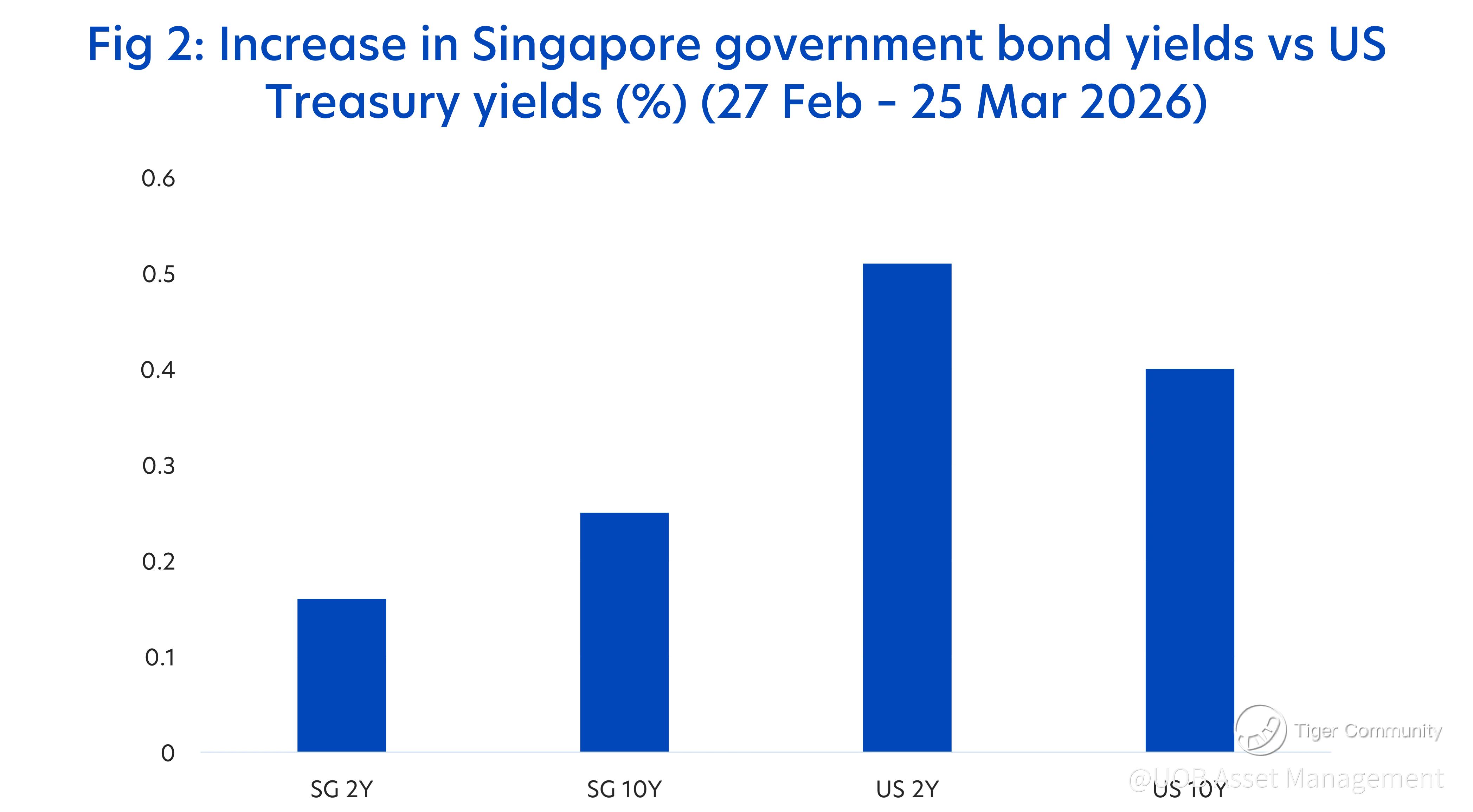 These dynamics are visible today. Despite a sharp rise in US Treasury yields following higher global energy prices, Singapore government bond yields have moved only modestly higher, reflecting their relatively low correlation with US Treasuries and Singapore’s strong policy credibility. For example, the yield on Singapore’s 2‑year government bond has risen by just 0.16 percent, compared with a 0.51 percent increase in the US 2‑year Treasury.