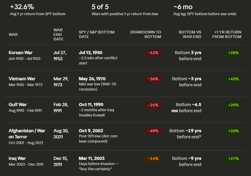 Long wars matter less. Afghanistan lasted 20 years, but the market bottom was tied to the dot-com crash, not the war. Still, returns were strong after.