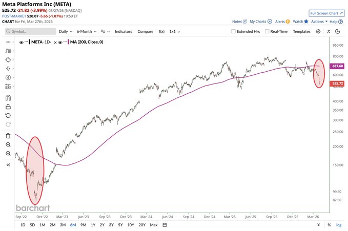 $META has now fallen below its 200-day moving average by the largest margin since 2022 📉📉📉