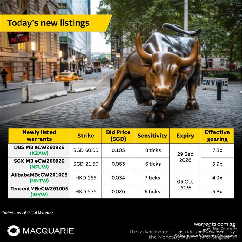 🆕Macquarie has listed 4 new call warrants tracking DBS, SGX, Alibaba and Tencent for investors keen to trade today's market rebound