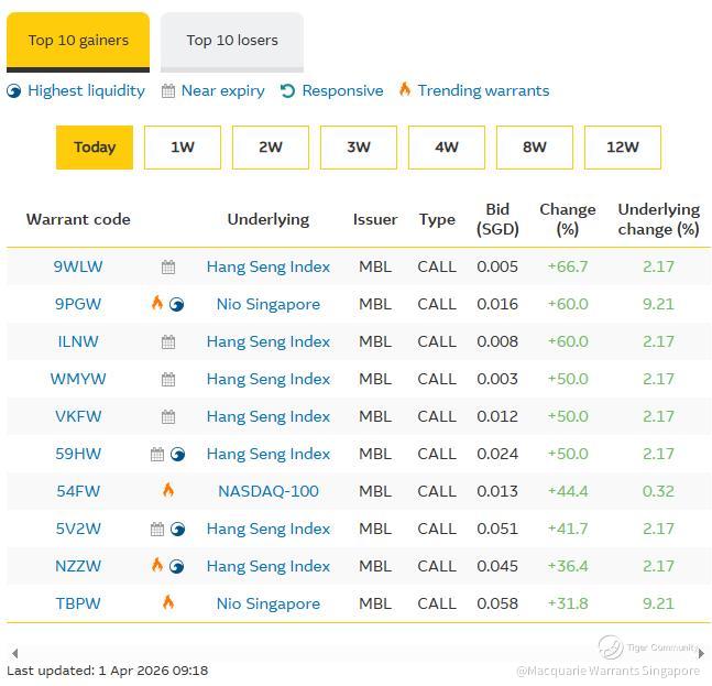 🔝Top performing warrants this morning as of 918AM are predominantly HSI call warrants that are clocking gains up to 67%