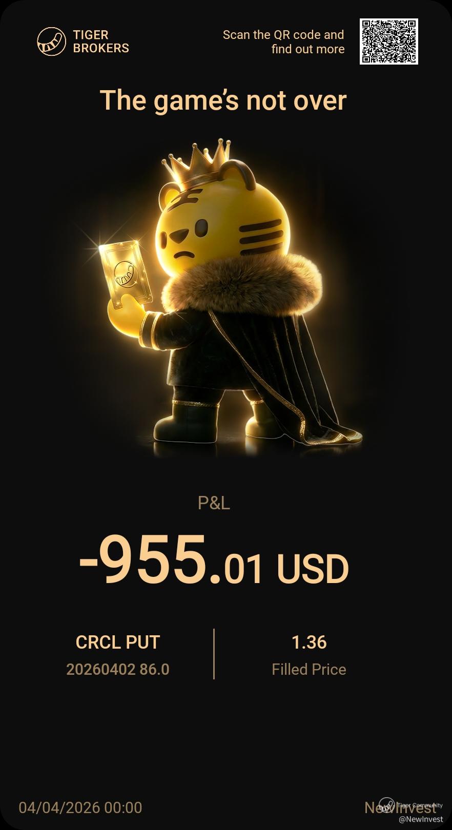 $CRCL 20260402 86.0 PUT$ Roll this PUT option to next week at lower strike price and higher premium when it went into the money at start of trading on Thurs, 2 Apr 2026. Though at the close of trading day, this PUT ended Out of the money[Facepalm] , no regrets to de-risk as no intention to buy in. Hope can soon soon to collect premium next week.[Bless]