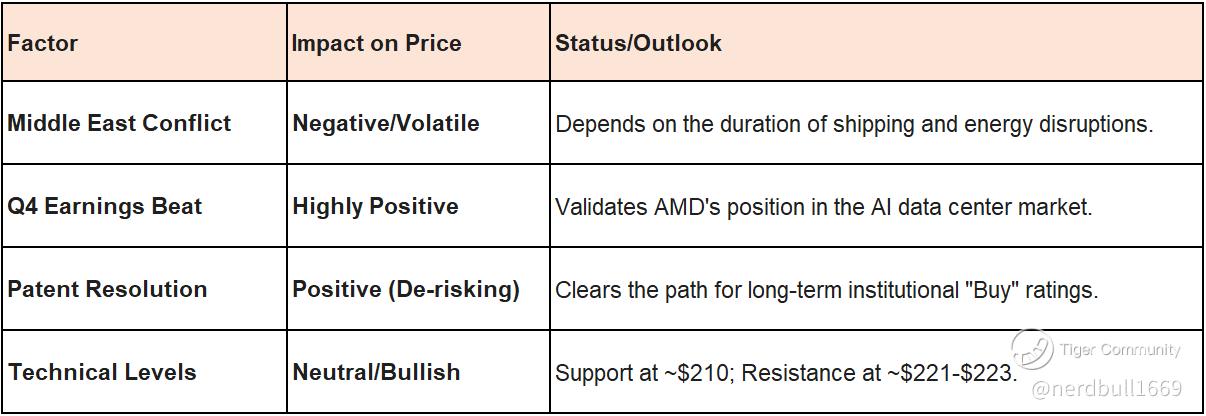 Bottom Line: While geopolitical tension creates a "fog" that makes $220 feel like a struggle, AMD’s underlying fundamentals—driven by record revenue and the resolution of legal overhangs—suggest that the long-term price target remains significantly higher than current levels. A short rally above $220 is likely if Middle East tensions show any sign of de-escalation by mid-April.