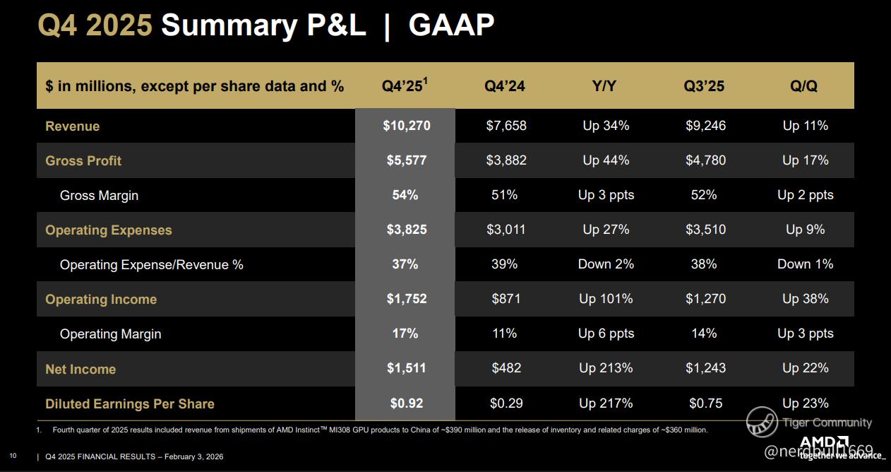 • Record Performance: Q4 revenue hit $10.3 billion (up 34% YoY), driven largely by the Data Center segment, which saw a 39% increase thanks to EPYC and Instinct GPU sales.