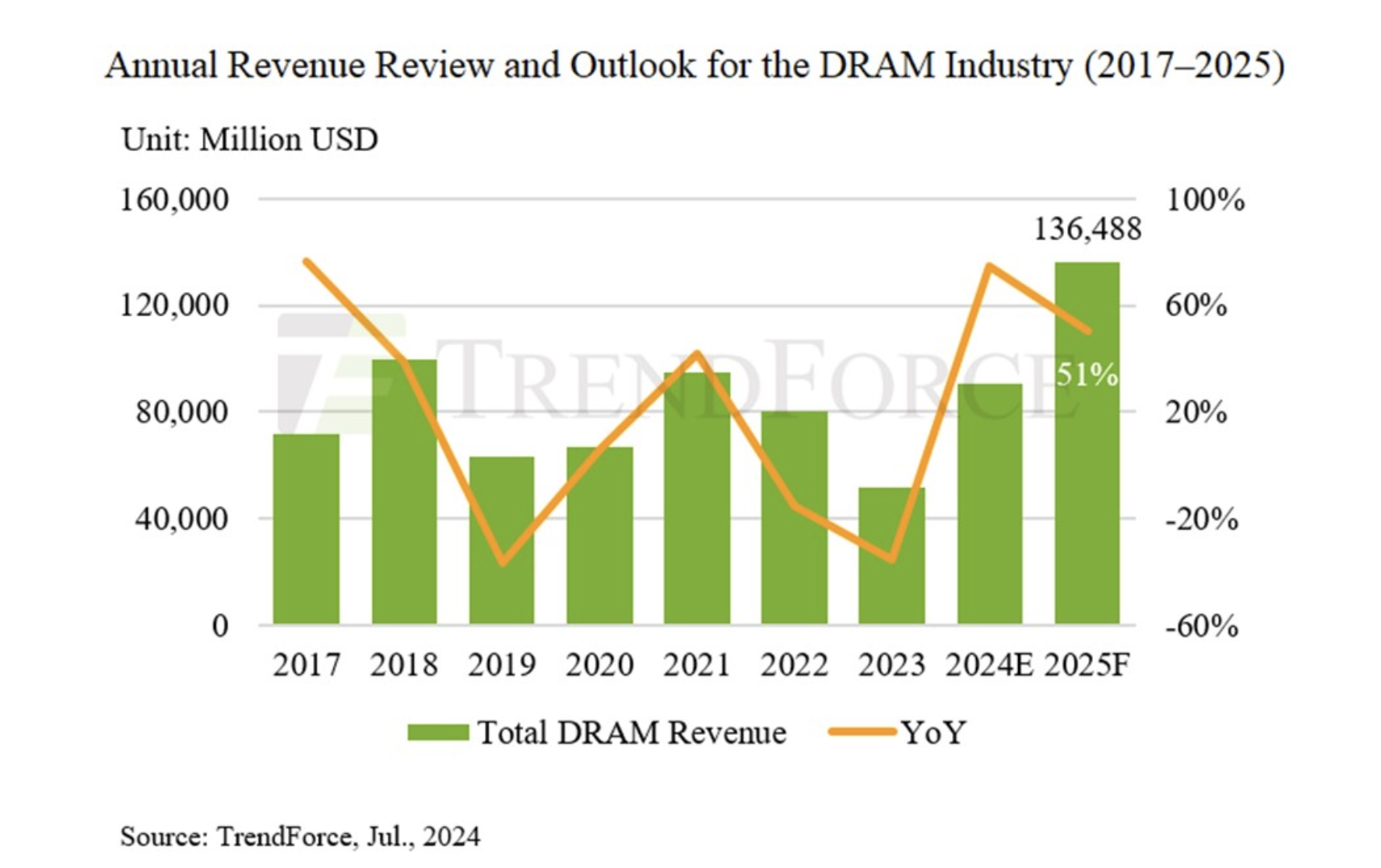 儲存晶片主要分為DRAM(動態隨機存取記憶體)和NAND Flash(快閃記憶體)兩大類,前者負責高速資料存取,後者則擅長大容量非揮發性儲存。在AI時代,高頻寬記憶體(HBM)作為DRAM的進階版本,成為GPU/加速器不可或缺的核心元件。一臺AI伺服器對HBM與DRAM的需求量,是傳統伺服器的數倍甚至十倍以上,這直接推升了全球記憶體位元需求。
