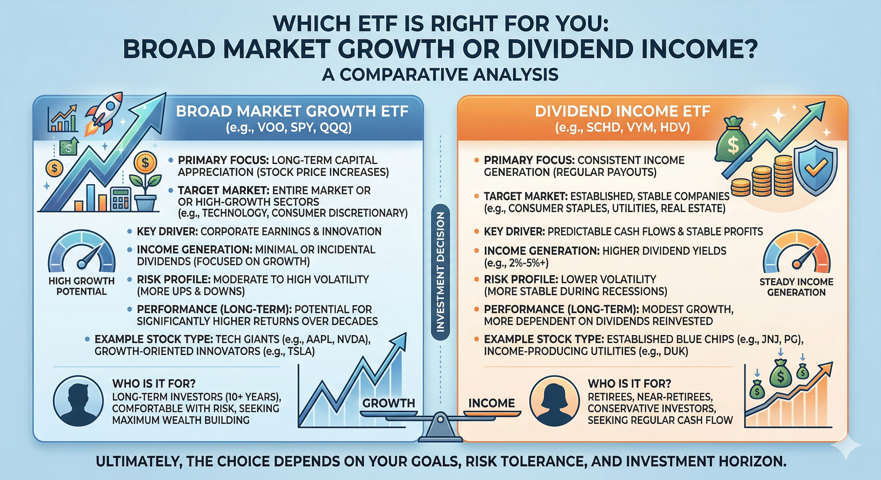Which ETF Is Right for You: Broad Market Growth or Dividend Income?