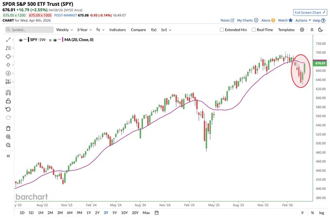 S&P 500 may have closed above its 200-day MA, but one hurdle remains: The 20-week moving average with the $SPY currently on track for a 6th consecutive close below it 🚨📉