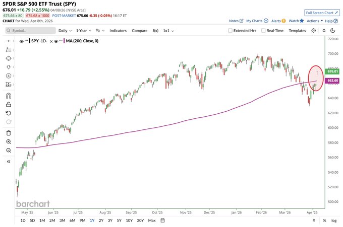 S&P 500 $SPY posts first close above the 200-day moving average in 14 trading days 📈🥳🫂