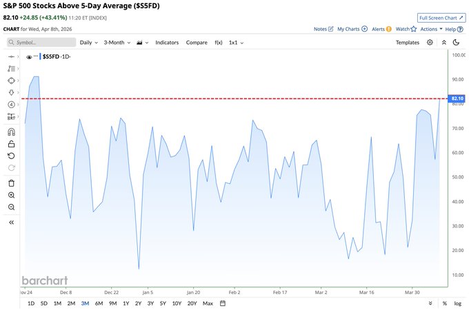 More than 82% of S&P 500 stocks are now trading above their 5-day moving average, the strongest short-term market breadth since November 📈🥳🫂