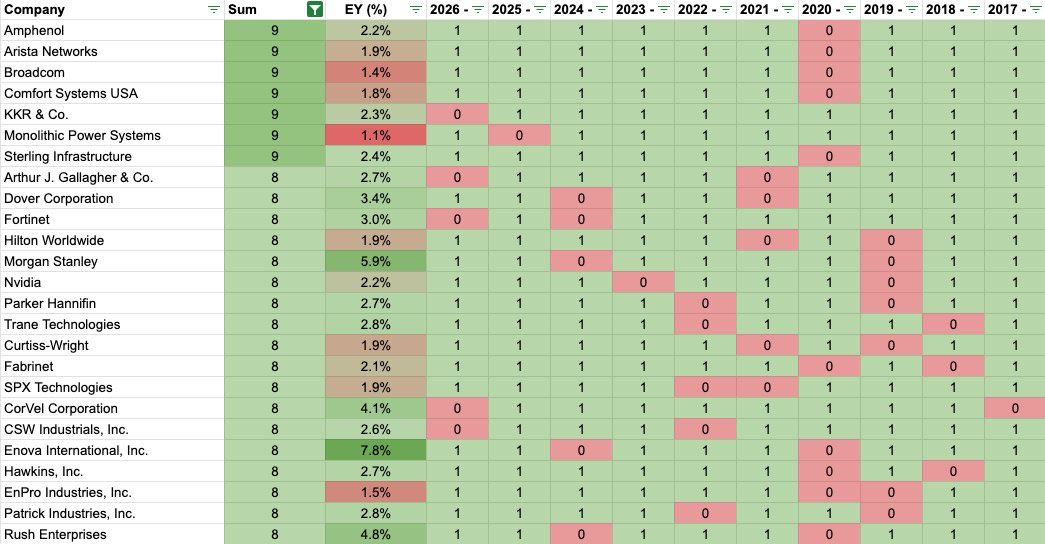 $Amphenol(APH)$ $Arista Networks(ANET)$ $Broadcom(AVGO)$ $Comfort Systems USA(FIX)$ $KKR & Co LP(KKR)$ $Monolithic Power(MPWR)$ $Arthur J. Gallagher(AJG)$ $Dover(DOV)$ $Fortinet(FTNT)$ $Morgan Stanley(MS)$ $NVIDIA(NVDA)$ $Parker Hannifin(PH)$ $Trane Technologies PLC(TT)$ $Curtiss-Wright(CW)$