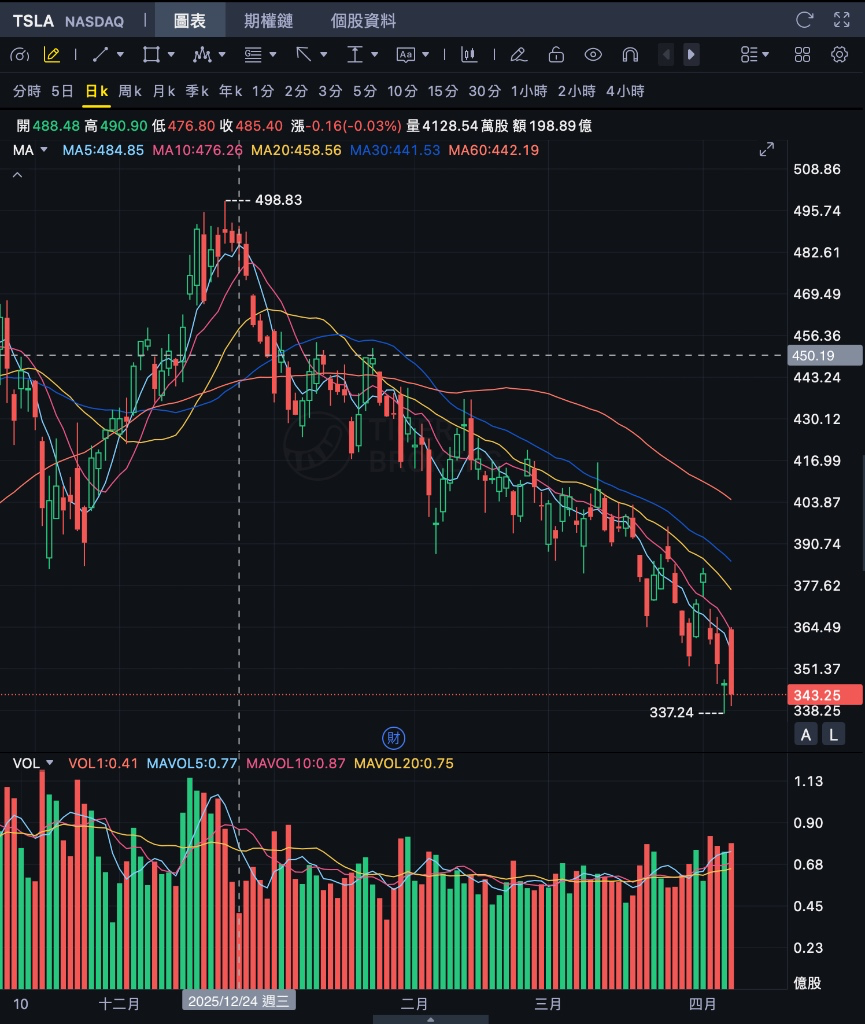 關鍵心理關口的失守:2026年3月19日,受能源存儲部署不及預期的傳聞影響,股價觸及26周低點381.31美元;而到了4月初,在第一季度災難性的交付報告披露後,股價更是直接以放量大陰線跌破了350美元的關鍵支撐位,最低探至 337.24美元,單日跌幅一度超過5.4%。