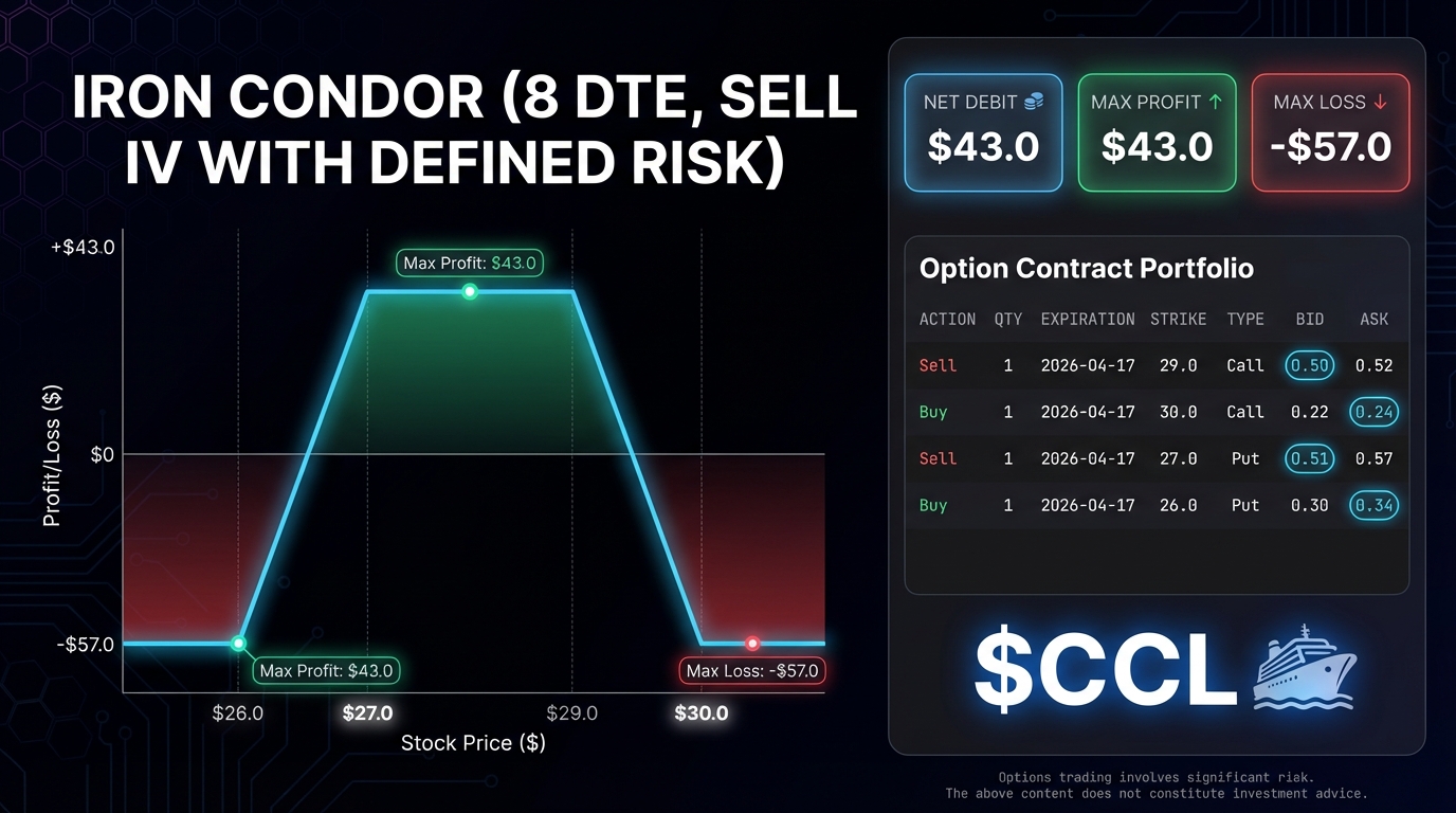 $CCL Iron Condor Strategy: $57 Cost, Max Earn $43 by Apr 17, 2026