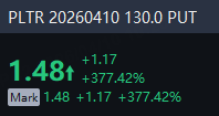 A total number of 1.27M options related to $Palantir Technologies Inc.(PLTR)$ were traded on Thursday, up 87% from the previous trading day, of which call options accounted for 54%. Particularly high volume was seen for the $130 strike put option expiring Apr. 10 with 54,565 contracts trading. $PLTR 20260410 130.0 PUT$