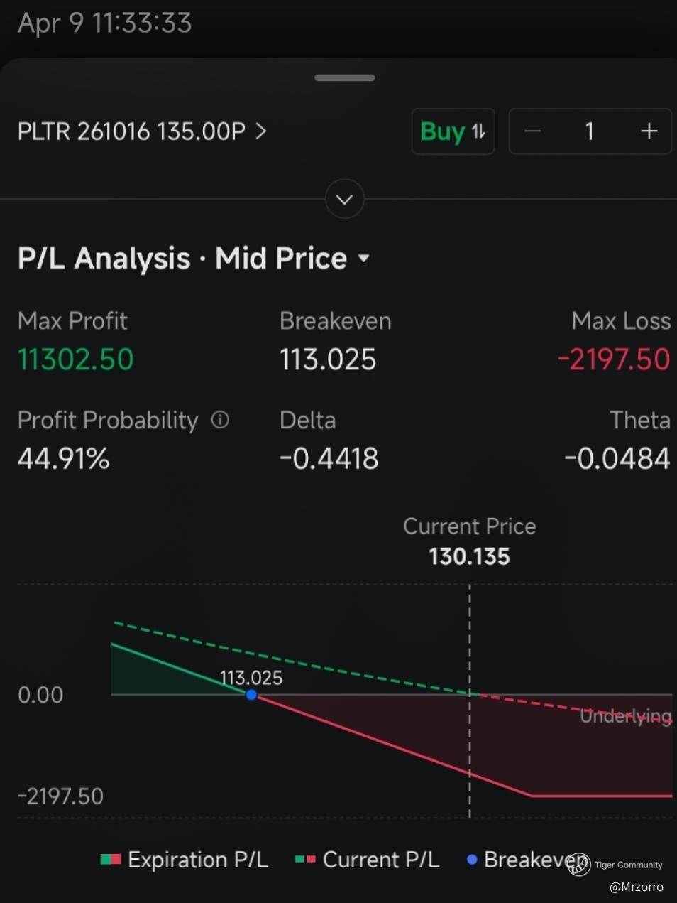 At 11:33:33 a.m., an active buyer paid a $4.4 million premium for put options that give their holder the right to sell Palantir shares at $135 in the next 190 days. At current prices and volatility, a similar trade has a profit probability of 44.91% for the buyer.