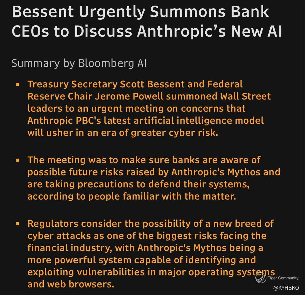 US Treasury Secretary Scott Bessent and Federal Reserve Chair Jerome Powell called Wall Street leaders to an ‘urgent meeting’ on concerns that the latest AI model from Anthropic will ‘usher in an era of greater cyber risk’, according to Bloomberg report.