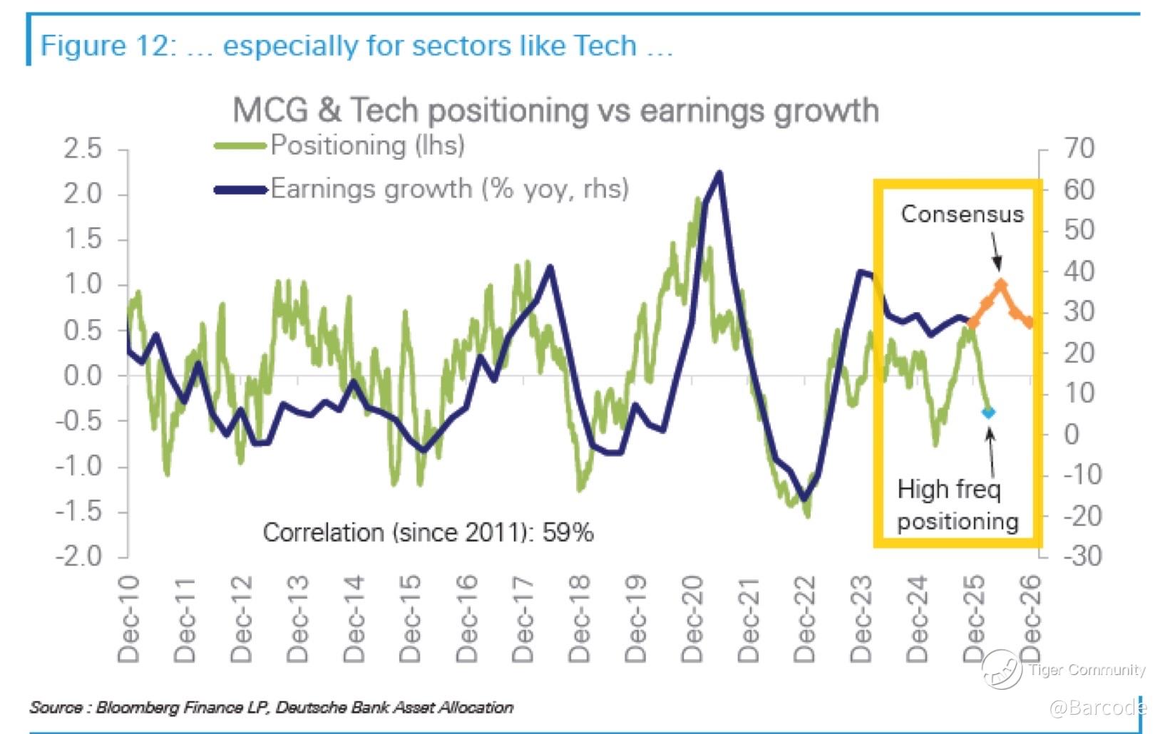 Consensus still points to ~30% earnings growth across mega-cap tech, yet current price action is implying contraction. Deutsche Bank has highlighted this divergence while upgrading software, noting AI disruption fears have peaked alongside ~29% YoY earnings growth in Q4 and rising forward estimates.