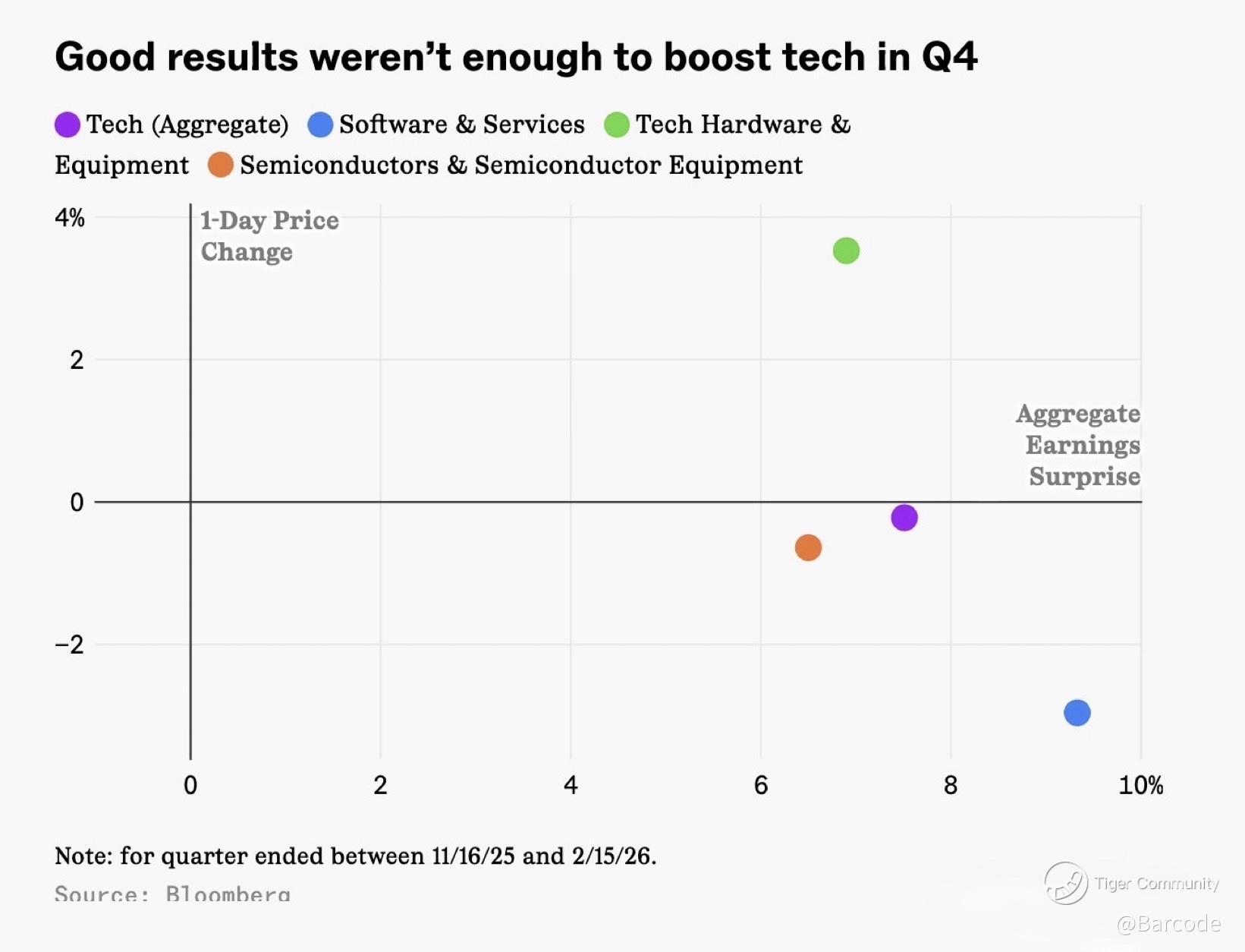 I’m watching a critical regime shift unfold where strong earnings are no longer the catalyst they once were. Q4 data captured this shift precisely. Tech delivered a clear aggregate earnings surprise, yet price action was near flat on the day. That divergence is the signal.