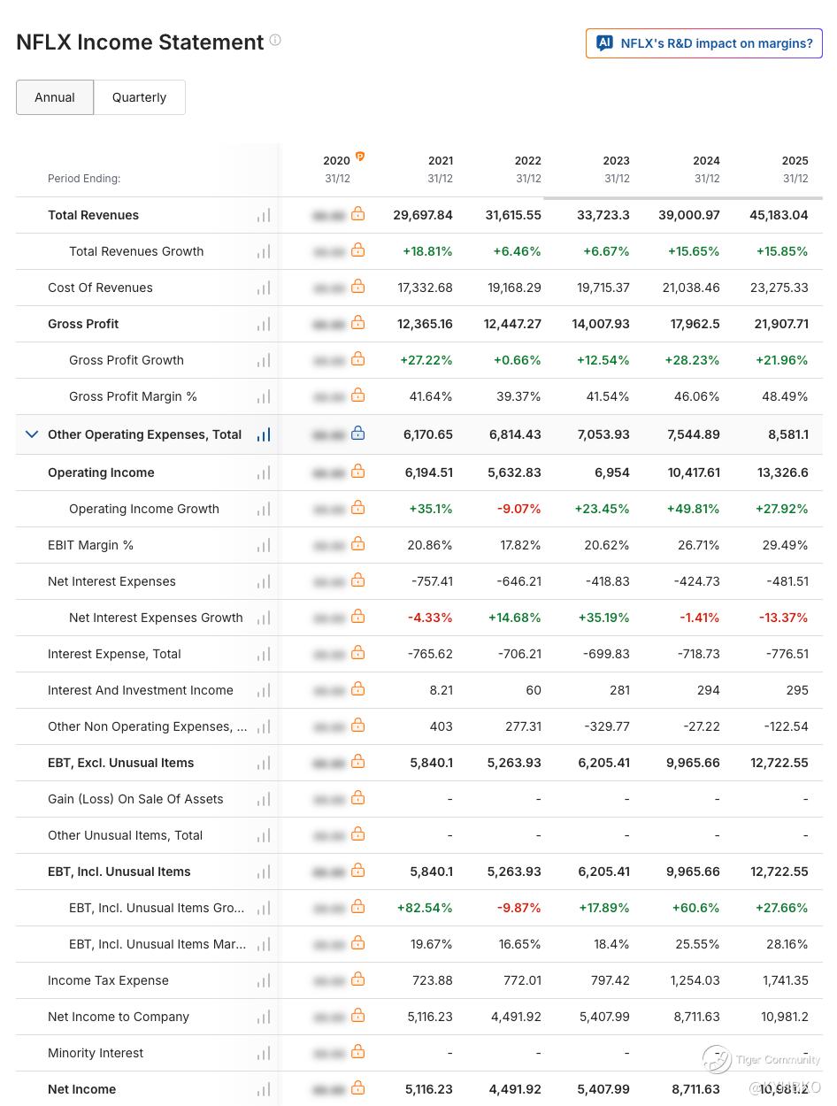 Netflix has demonstrated robust financial growth in recent years. The company’s annual revenue increased from $29.6 billion in 2021 to $45.1 billion in 2025, marking an impressive growth of approximately 50% over five years.