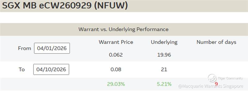 Trending SGX call warrant $SGX MB eCW260929(NFUW.SI)$ (https://warrants.com.sg/tools/livematrix/NFUW ) is newly listed this month on 1 April and trading 29% higher to $0.080 since its listing date, given SGX’s 5.2% gain to $21 (as of 4PM on 10 April 2026) during this period.