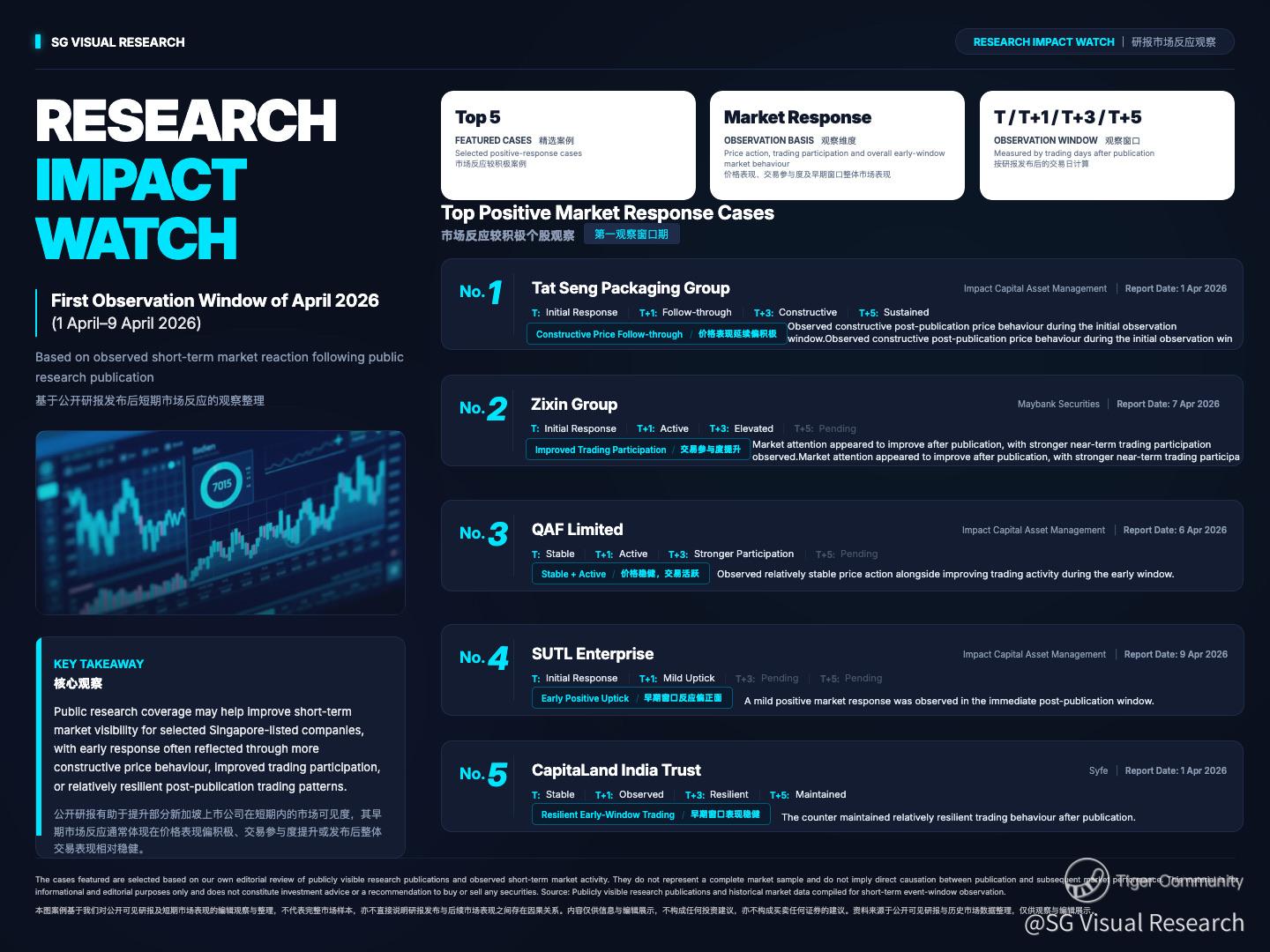 We reviewed selected publicly visible research publications released during the First Observation Window of April 2026 (1 April–9 April 2026) to see which Singapore-listed companies appeared to draw relatively stronger early market attention after coverage was published.