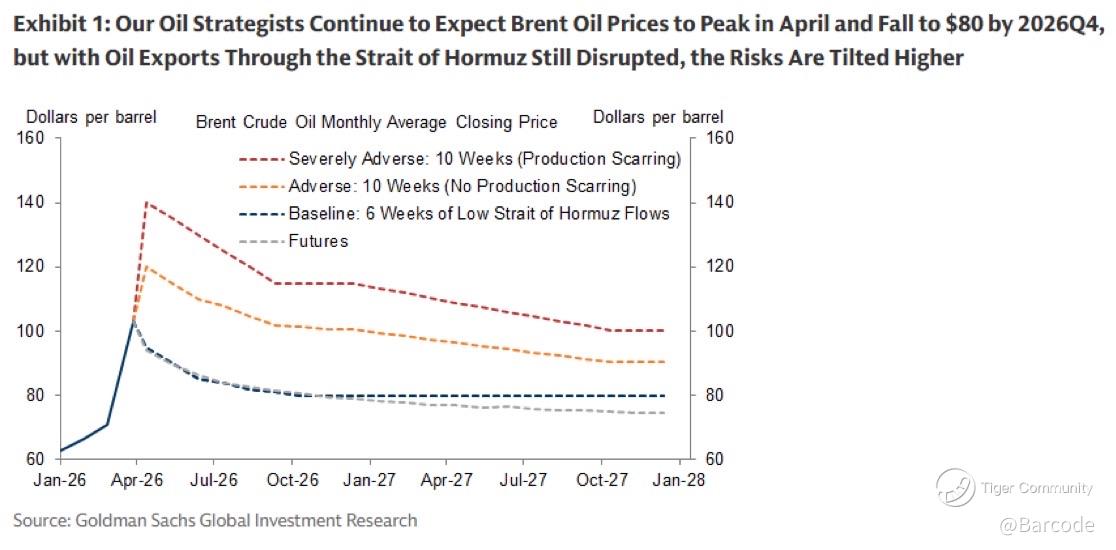 Goldman Sachs continues to anchor its baseline Brent trajectory toward ~$80/bbl by 2026Q4, but the distribution of outcomes remains decisively skewed to the upside: