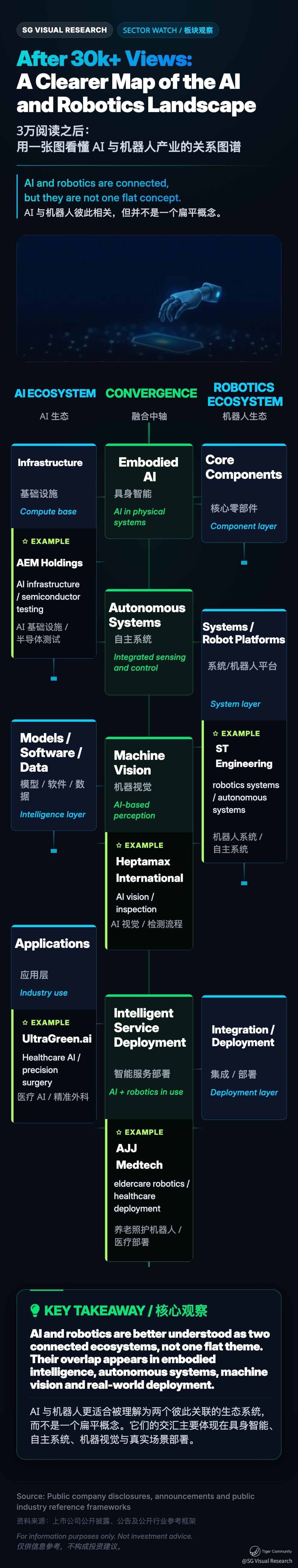 Yesterday’s post has now passed 30k+ views across platforms. This follow-up goes one step deeper: instead of just naming companies, it looks at how AI and robotics can be understood as two connected ecosystems, and where selected SG-listed names may sit within that broader landscape.