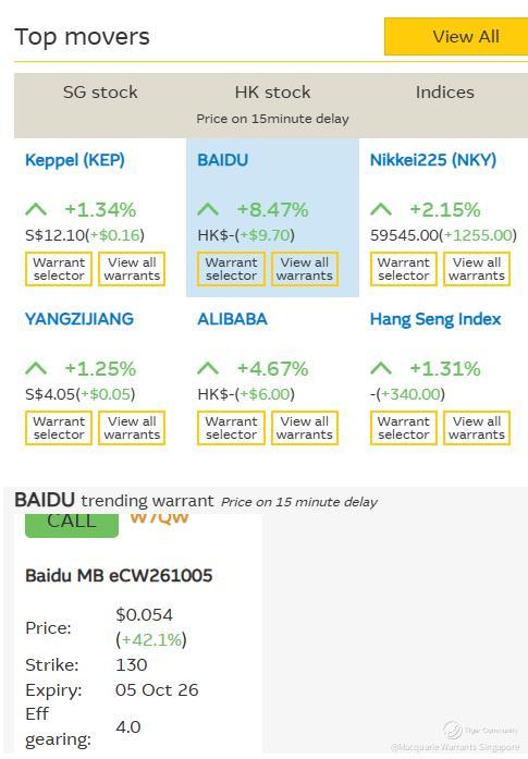 ✳Baidu shares $BIDU-SW(09888)$ jumped as much as 8.5% to HKD 124.30 while Macquarie's trending Baidu call warrant $Baidu MB eCW261005(W7QW.SI)$ (https://warrants.com.sg/tools/livematrix/W7QW) has rallied 42.1% to SGD 0.054 as of 1158AM