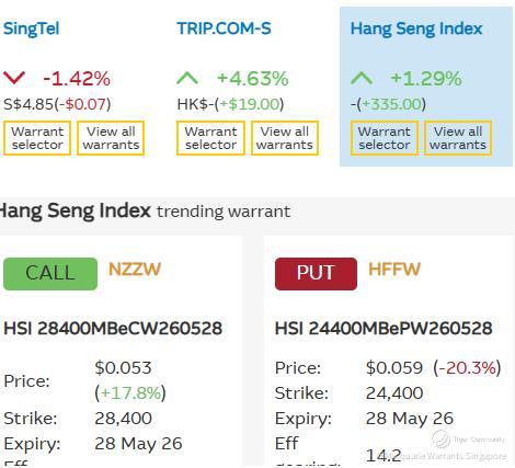 ✴✳Macquarie's trending HSI call $HSI 28400MBeCW260528(NZZW.SI)$ (https://warrants.com.sg/tools/livematrix/NZZW) is up 17.8% to SGD 0.053 on the HSI's +1.3% increase while trending HSI put $HSI 24400MBePW260528(HFFW.SI)$ (https://warrants.com.sg/tools/livematrix/HFFW) which is down 20.3% to SGD 0.059 is seeing strong demand of more than 10M units as of 12PM