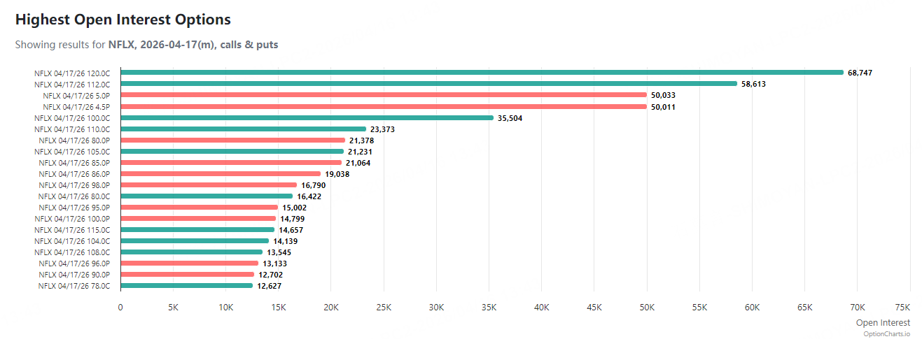 In terms of open interest (OI), call options significantly outnumber puts for the earnings week expiry (April 17, 2026). The $120 strike call has the highest OI at 68,747 contracts, followed by the $112 strike with 58,613 contracts, and the $100 strike with 35,504 contracts.