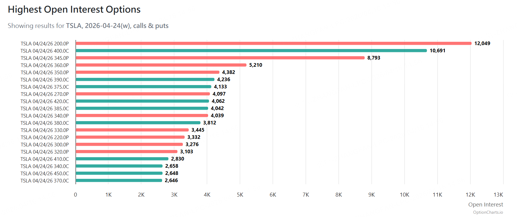 Based on the April 24, 2026 options chain, open interest is concentrated around several key strike levels: