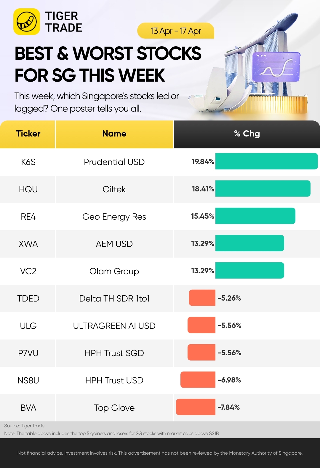In terms of individual stocks, $Prudential USD(K6S.SI)$ soared 20%; $Oiltek(HQU.SI)$ rose 18%; $Geo Energy Res(RE4.SI)$ rose 15%; $AEM USD(XWA.SI)$ and $Olam Group(VC2.SI)$ up 13%.