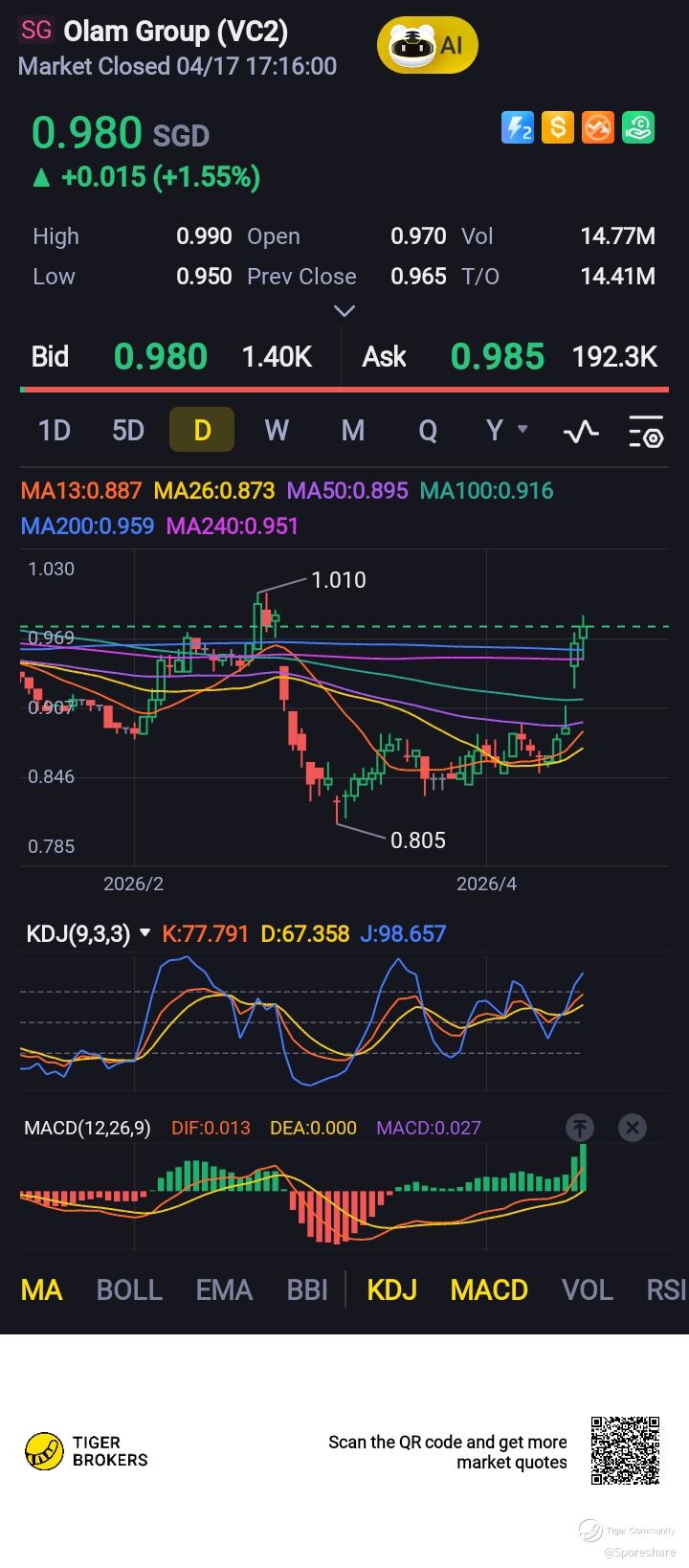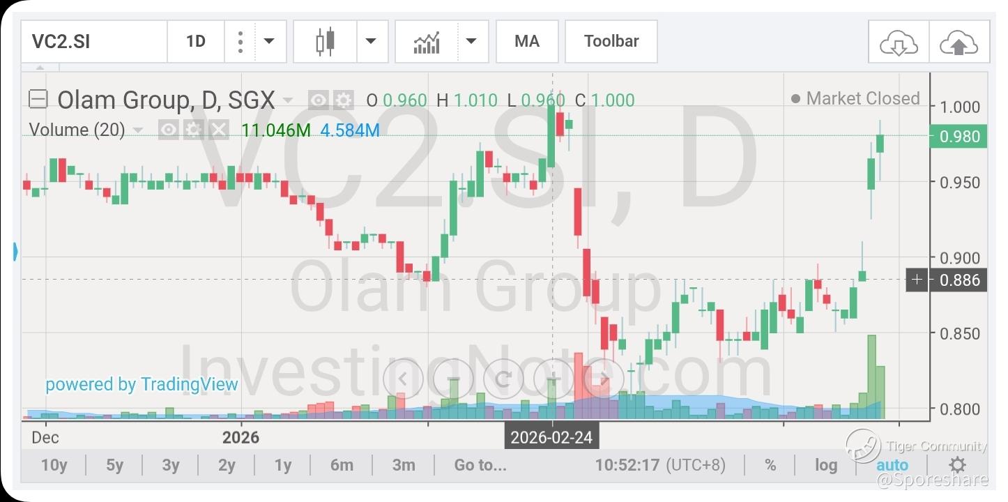 Olam Group - Gd news as it has manged to the regulatory approvals for its proposed US$1.8 billion sale of 44.58 per cent of its agribusiness unit Olam Agri to a Saudi fund. Going forward, they can focus in expanding Olam OFI and hopefully have the IPO listing news soon! Their plan is to pared down assets and repay all debts to gain debts free position. Hopefully, can see price rising above 1.00 and perhaps going up further towards 1.20-1.30 level. Pls dyodd.