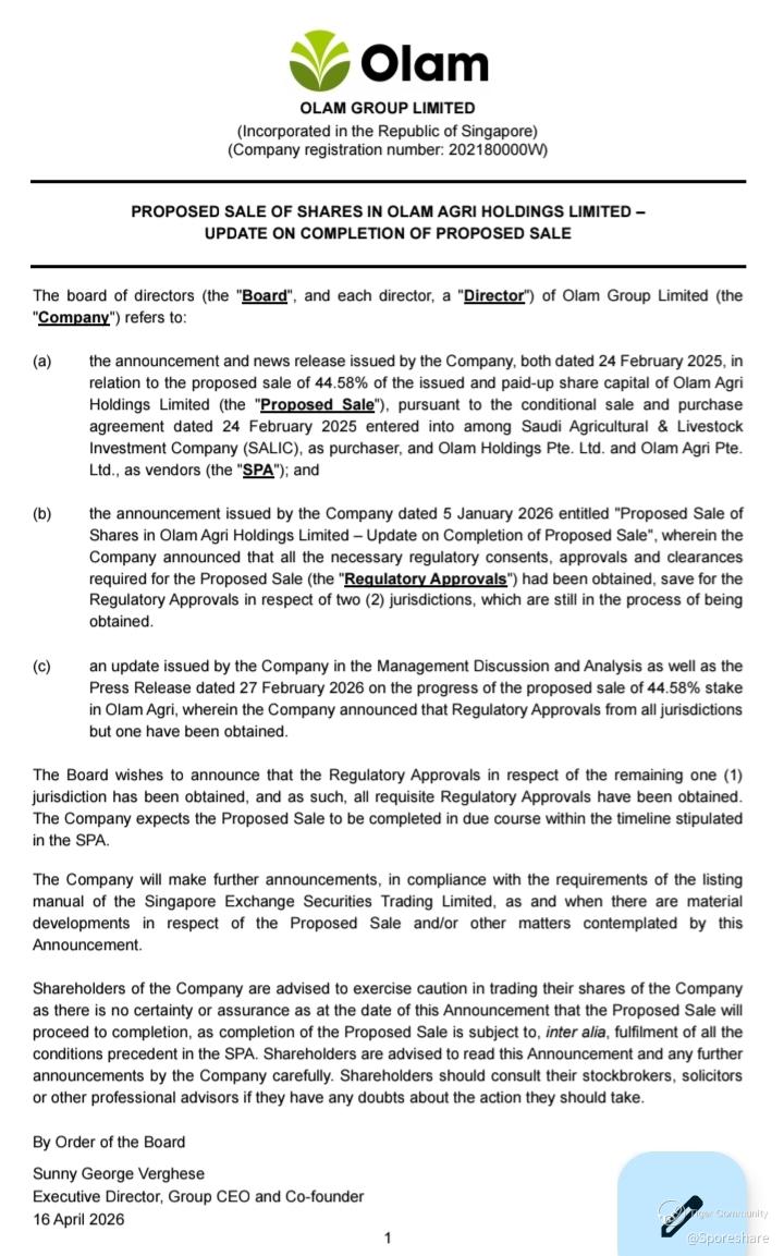 Quote: Olam Group has secured all required regulatory approvals from a total of 21 jurisdictions for its proposed US$1.8 billion sale of 44.58 per cent of its agribusiness unit Olam Agri to a Saudi fund.