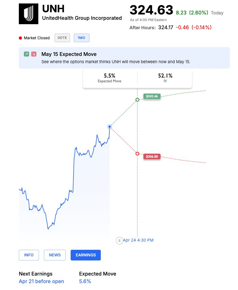$UnitedHealth(UNH)$ announces earnings before the opening bell on Tuesday this upcoming week. Expected move is 5-6%.