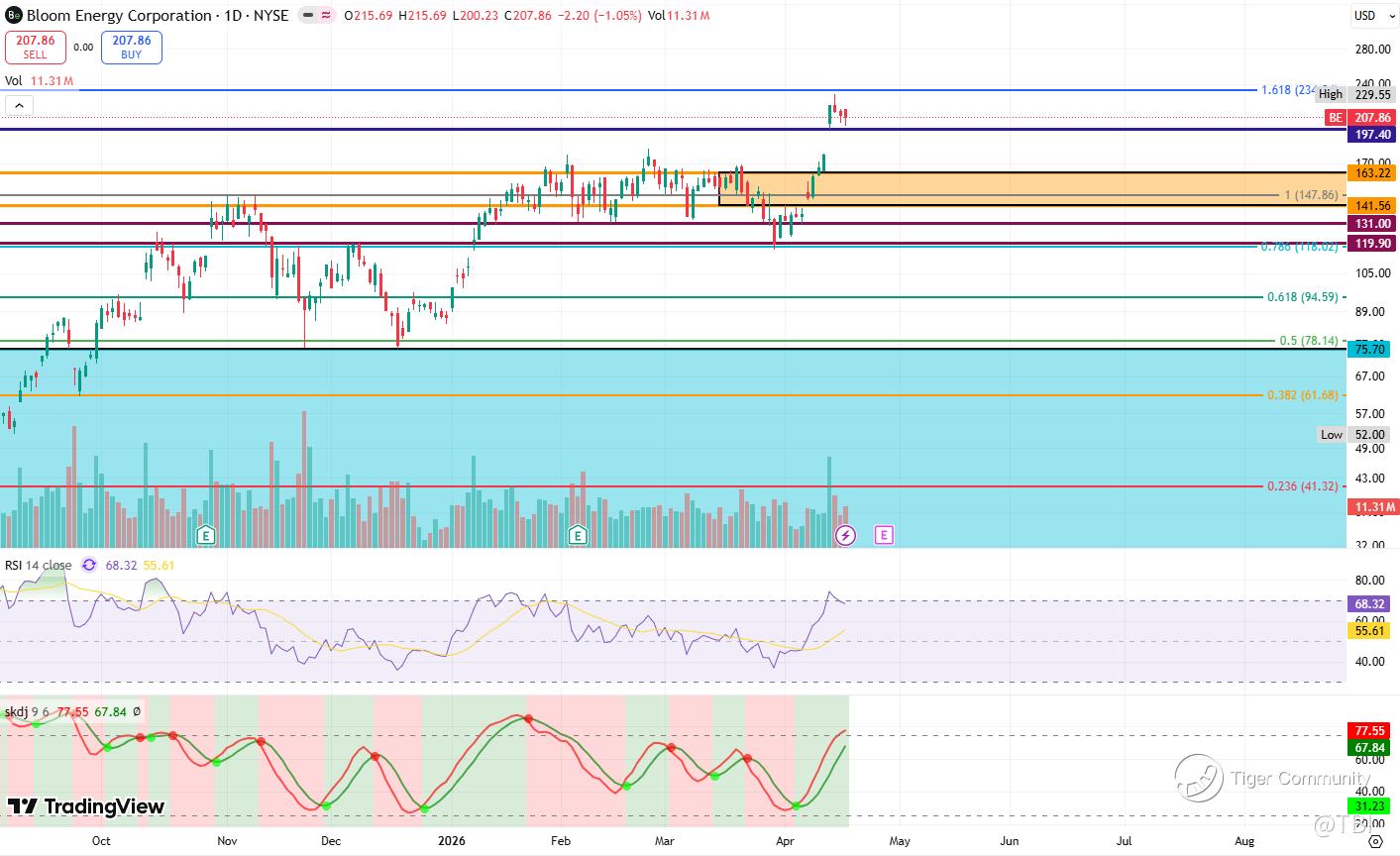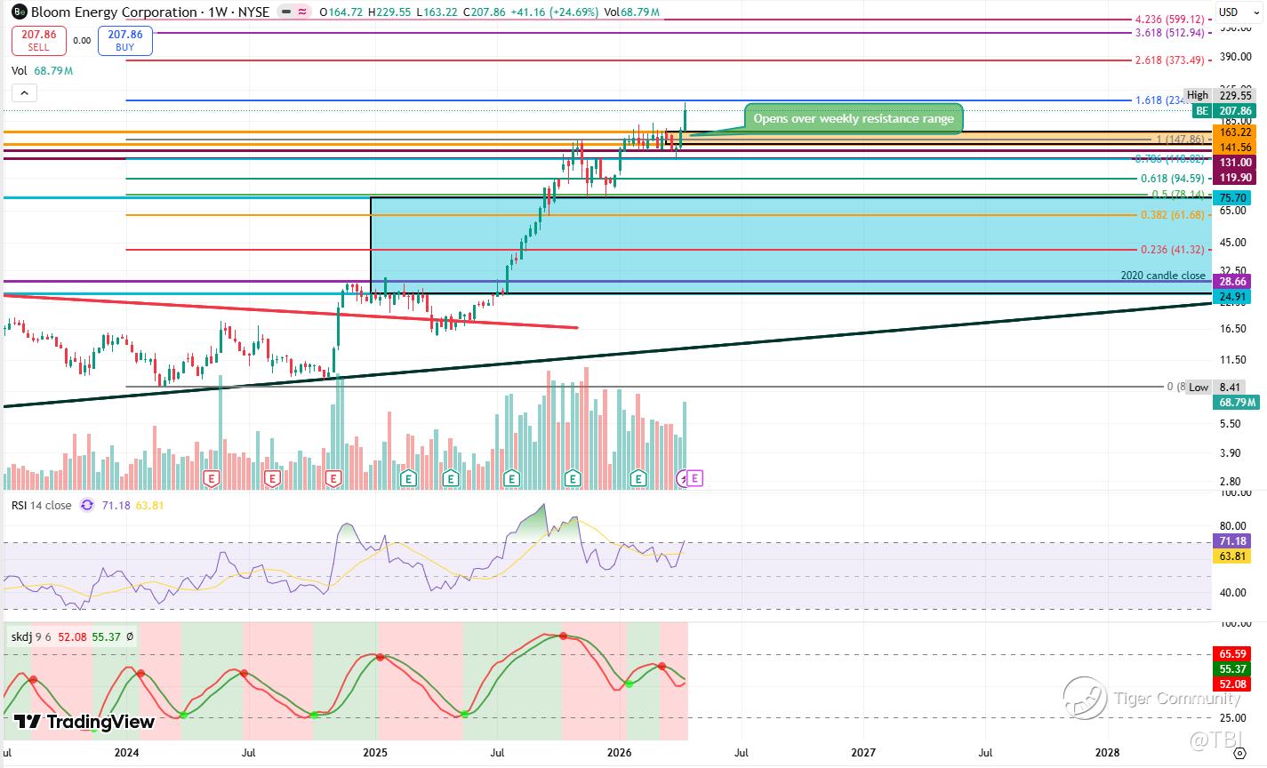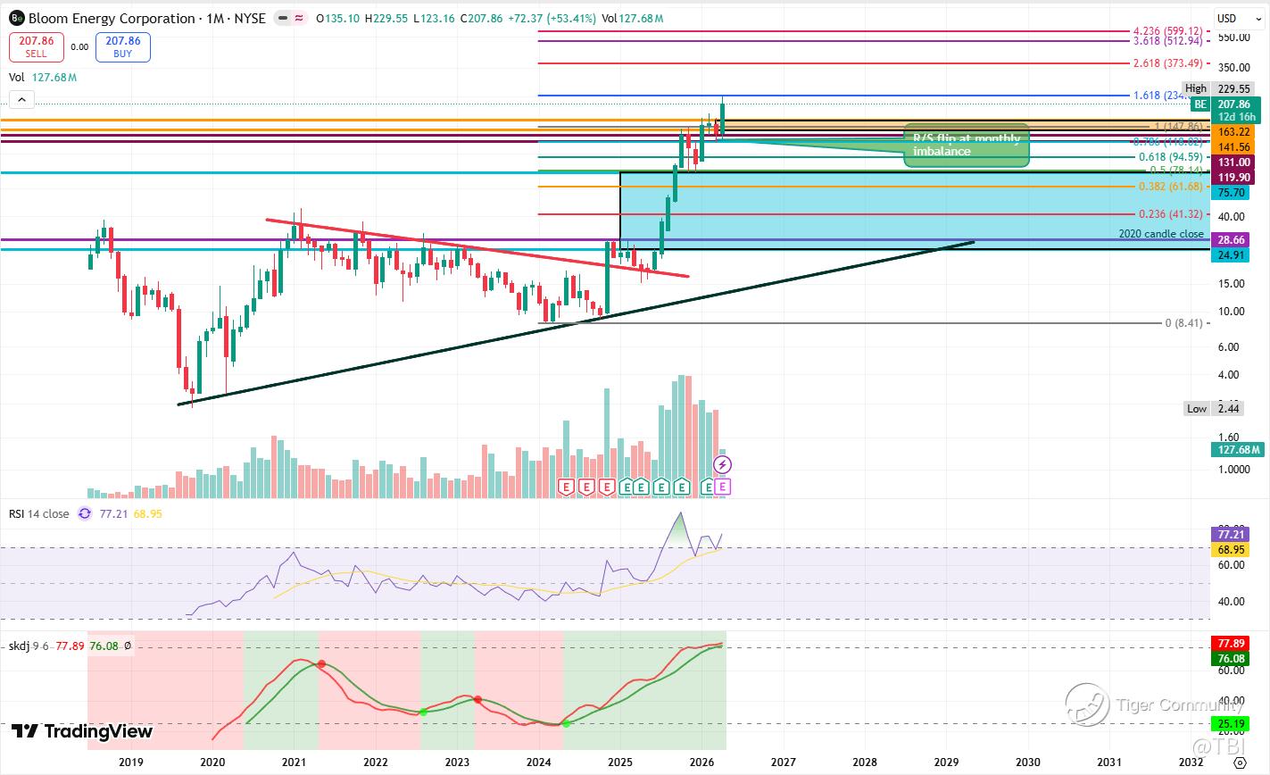 Overall Comments: On the whole, BE is in a strong uptrend after its resistance breakout in between May -July last year. While higher timeframes are showing extreme overbought RSI and stochastics, BE is still undergoing price discovery, with the 1.618 Fib extension sitting at 234.04.